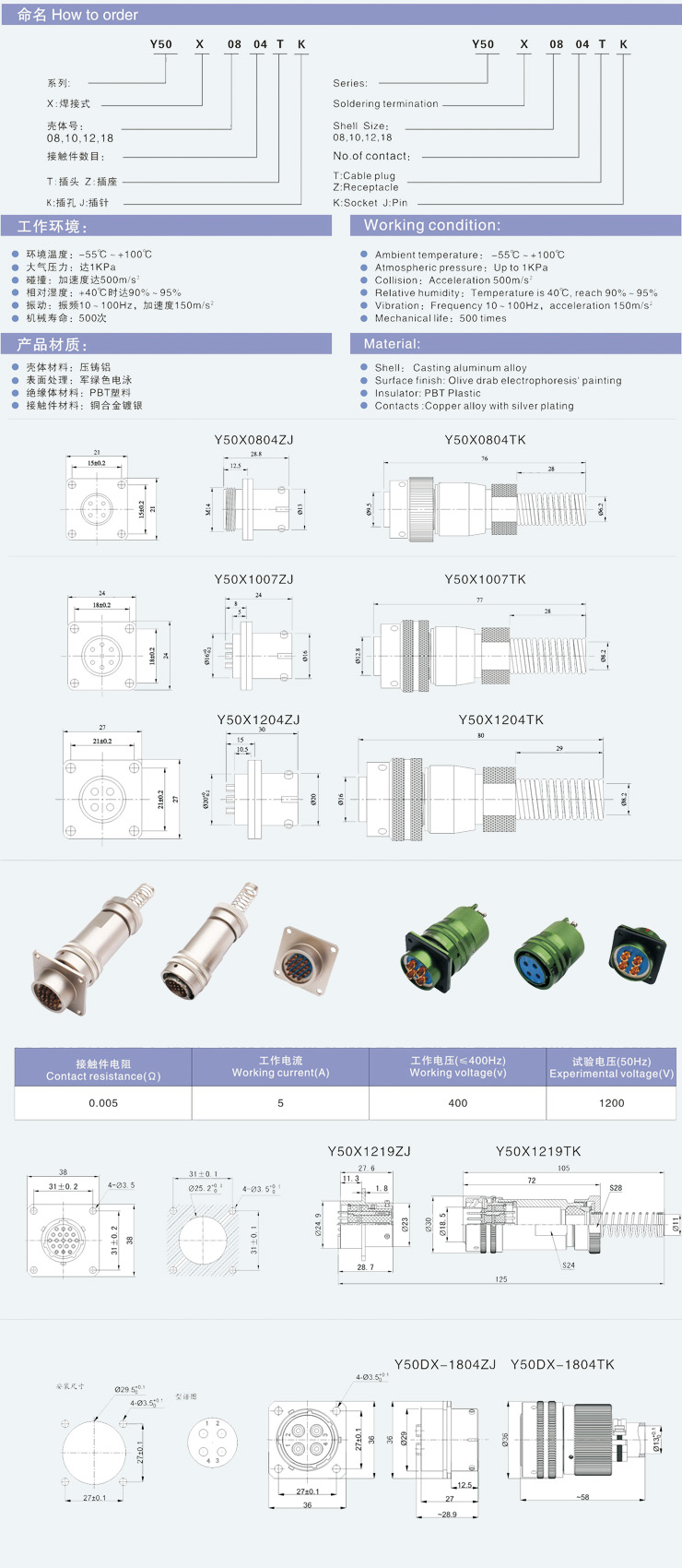Y50 series connectors owns quick connection and separation,small size,light weight,good sealing performance,the characteristics of the tensile properties superior.this series of products with reference to GJB101A,apply to the teleconmunications number of the strategic,tactical systems,field operations,electricity connections.